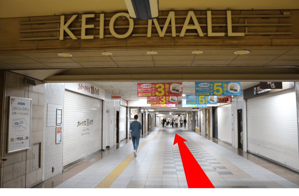 京王モール商品館の看板下を直進し、京王モールのアーケードを左折します。