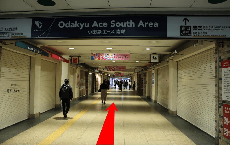 「新宿駅西口広場イベントコーナー」を左奥に進んでください。「小田急エース南館」のアーケードを目指します。